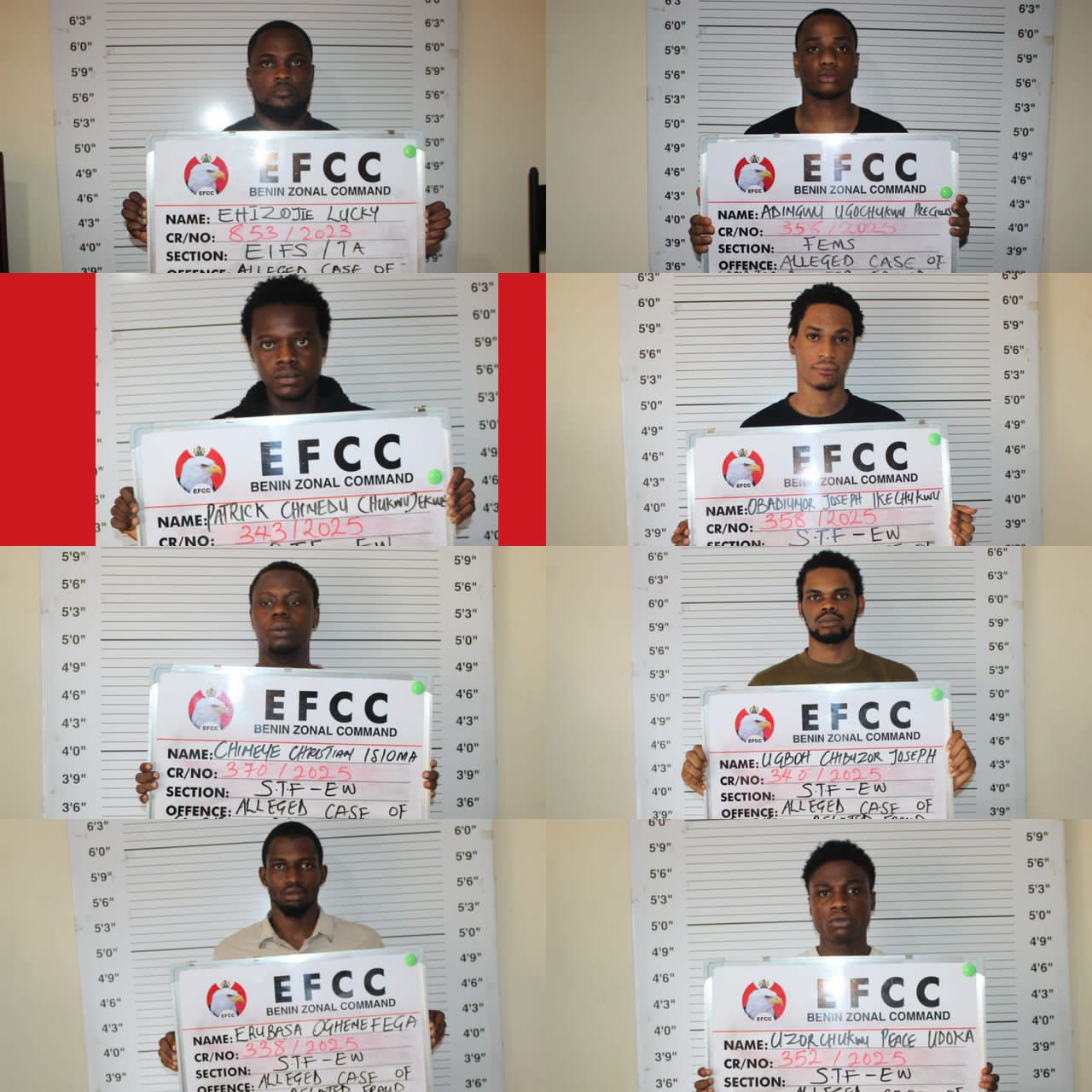 Justice W.I. Aziegbemhin convicted and sentenced Uzorchukwu Peace Udoka, Erubasa Oghenetega, Ajayi Aisosa to two years imprisonment, each or to pay N200, 000 (Two Hundred Thousand Naira) fine respectively. The duo of David Ogwunu, Lucky Ehizojie were convicted and sentenced to Three Years Imprisonment each or to pay N500, 000 (Five Hundred Thousand Naira) fine respectively